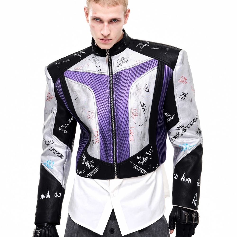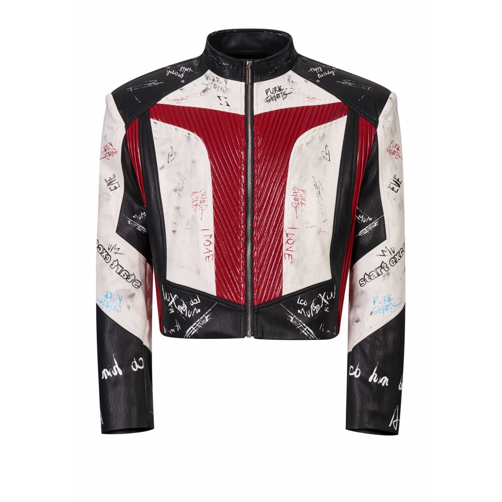 Short Stand-up Collar Graffiti Leather Jacket For Men